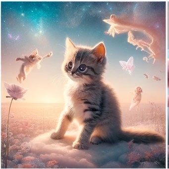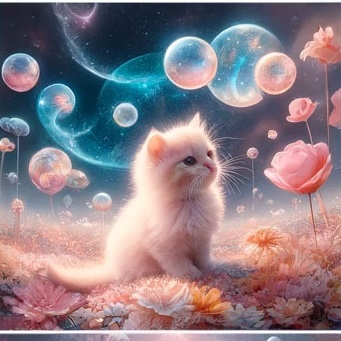 길몽: 새끼 고양이가 건강하고 활발하게 뛰노는 모습, 따뜻한 사랑을 받으며 보호받는 꿈은 긍정적인 변화, 안정, 행복한 관계를 상징합니다.